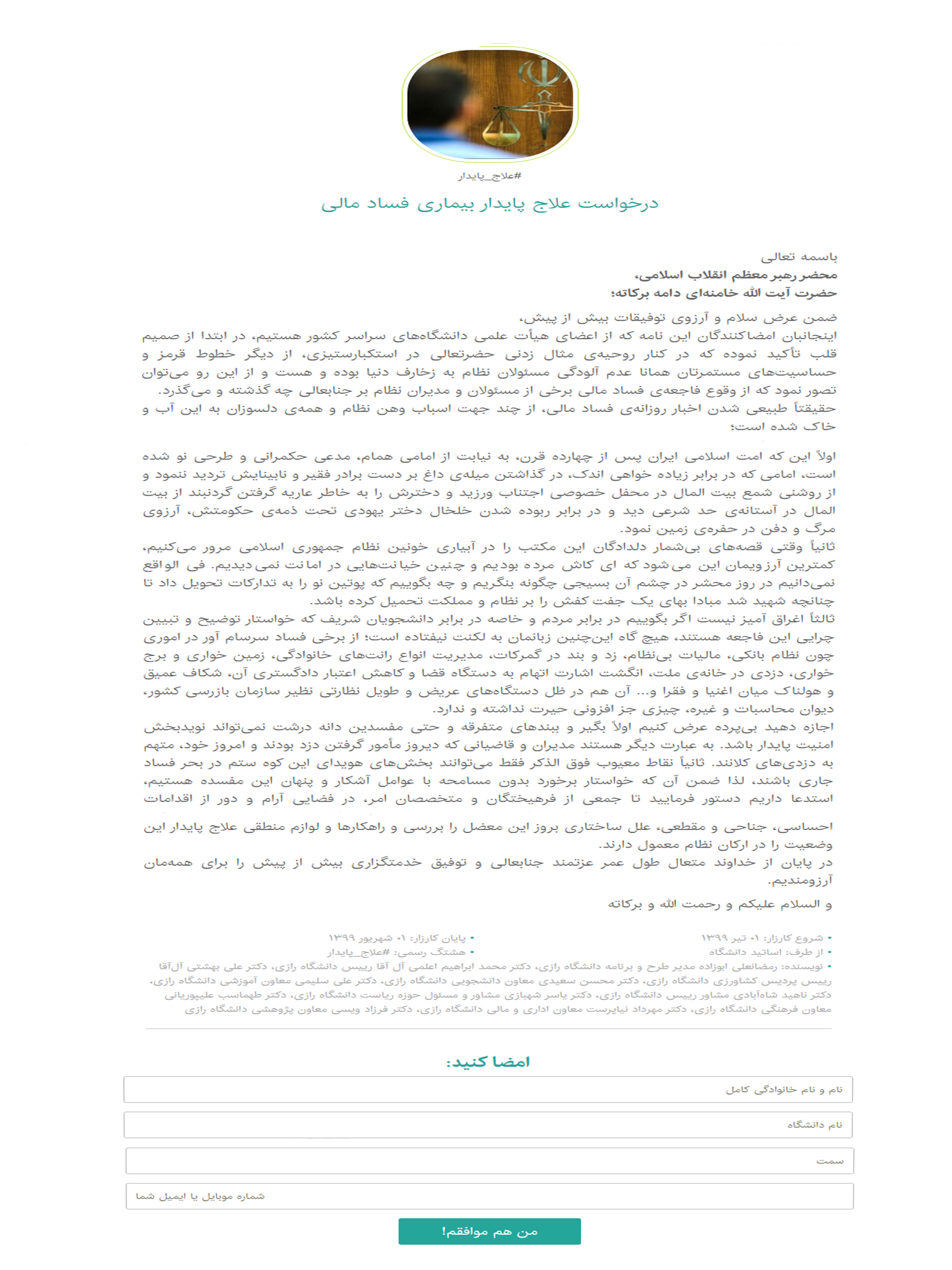 در هفتۀ گذشته نامه­ ای با امضای چند نفر از استادان محترم دانشگاه رازی جهت تأیید و ارسال به محضر مقام معظم رهبری(دامت برکاته) در دسترس استادان محترم دانشگاه قرار گرفت.