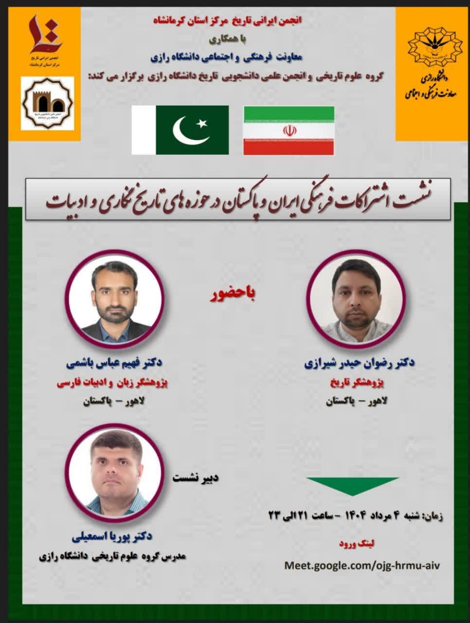 794 نشست اشتراکات فرهنگی ایران و پاکستان در حوزههای تاریخ نگاری و ادبیات با حضور : دکتر رضوان حیدر شیرازی پژوهشگر تاریخ لاهور - پاکستان دکتر فهیم عباس باشمی پژوهشگر زبان و ادبیات فارسی لاهور -...