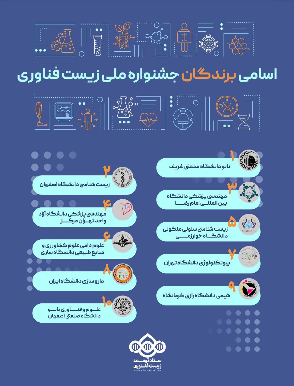1- نانو دانشگاه صنعتی شریف 2- زیست شناسی دانشگاه اصفهان 3- مهندسی پزشکی دانشگاه بین المللی امام رضا 4- مهندسی پزشکی دانشگاه آزاد واحد تهران مرکز 5- زیست شناسی سلولی مولکولی دانشگاه خوارزمی 6- علوم دامی علوم کشاورزی و منابع طبیعی دانشگاه ساری 7- بیوتکنولوژی دانشگاه تهران 8- داروسازی دانشگاه ایران 9- شیمی دانشگاه رازی کرمانشاه 10- علوم و فناوری نانو دانشگاه صنعتی اصفهان.