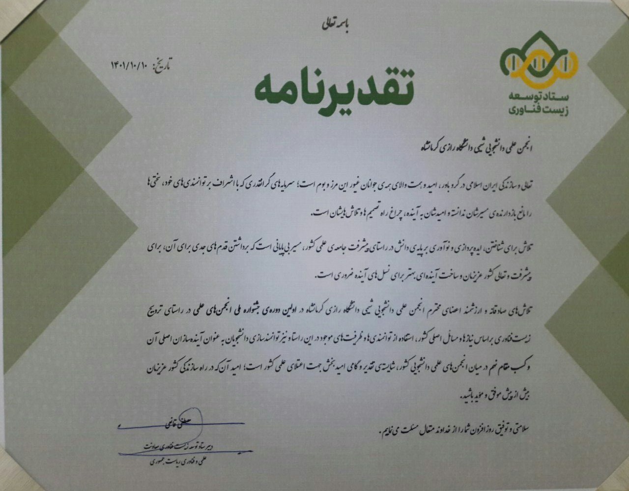 در اولین جشنواره ملی انجمن‌های علمی - دانشجویی زیست فناوری کشور، انجمن علمی شیمی دانشگاه رازی در میان 10 انجمن برتر قرار گرفت.