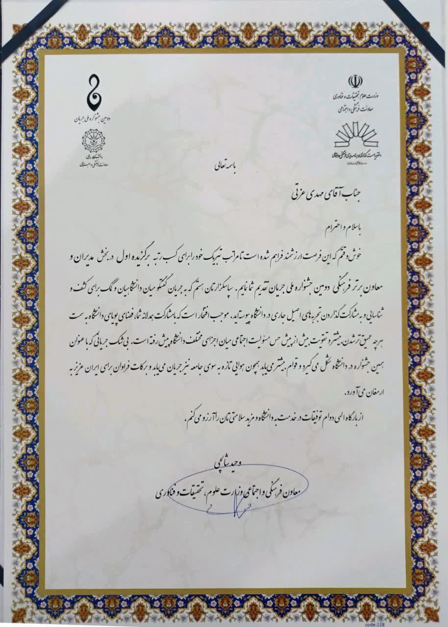 دکتر مهدی عزتی – رتبه یک سطح یک در بخش مدیران و معاونان فرهنگی و اجتماعی و رتبه دو سطح یک در حوزه کنشگری داوطلبانه
