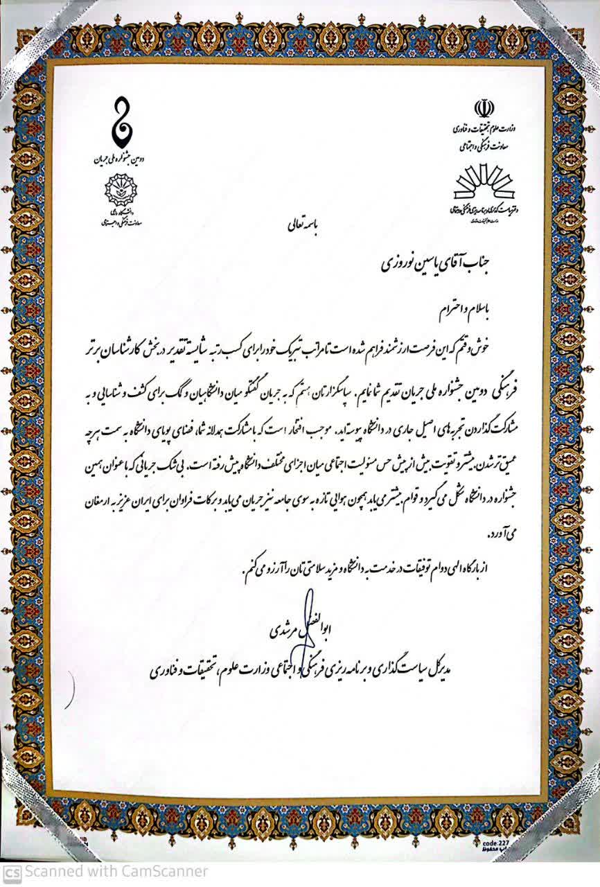 دکتر یاسین نوروزی – بخش کارشناسان فرهنگی و اجتماعی، شایسته تقدیر